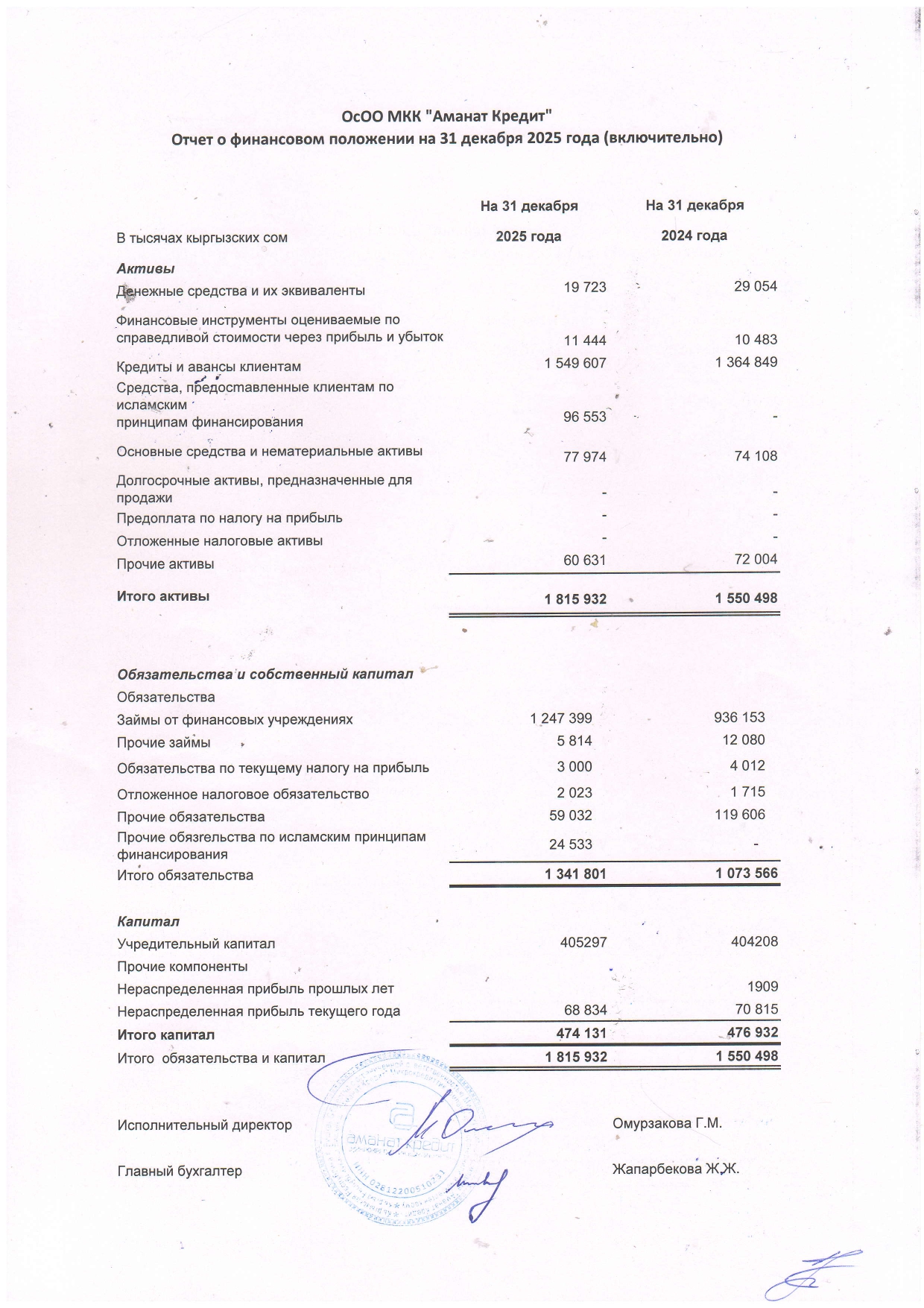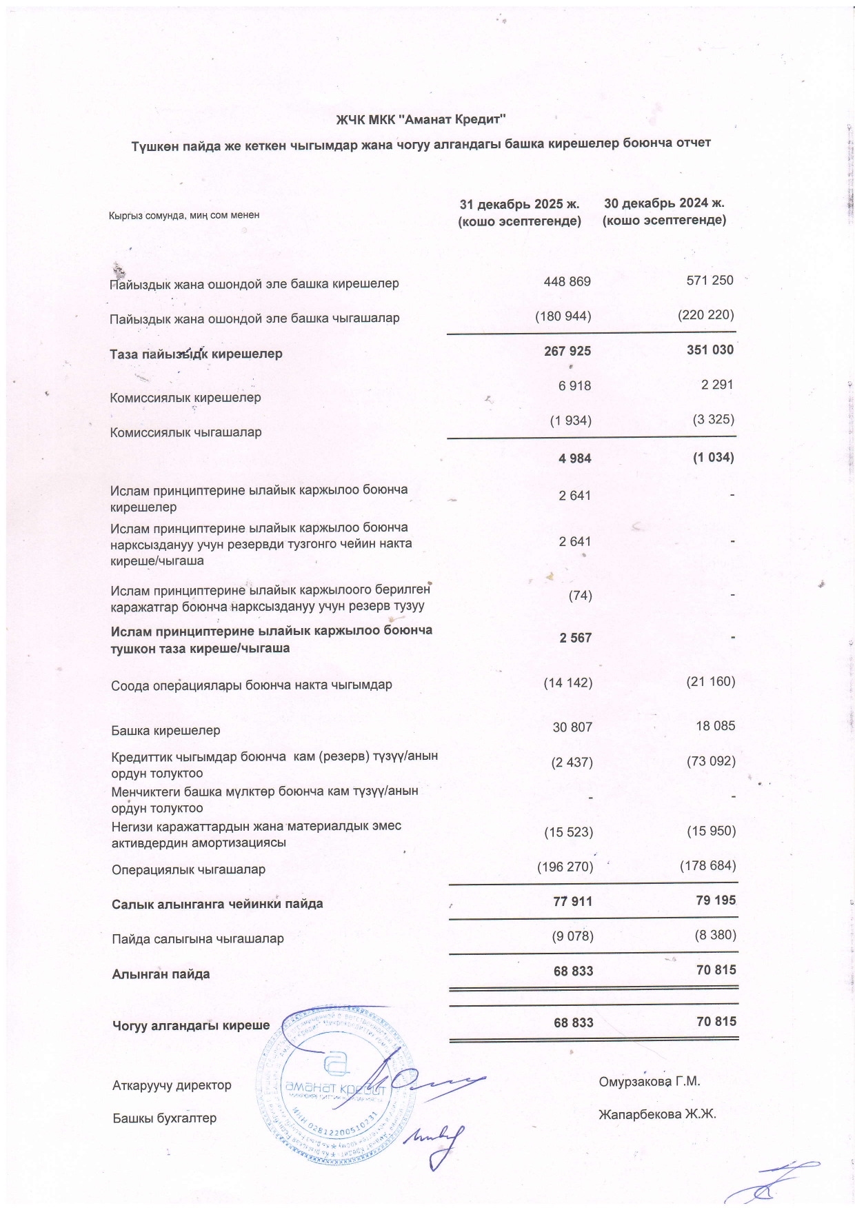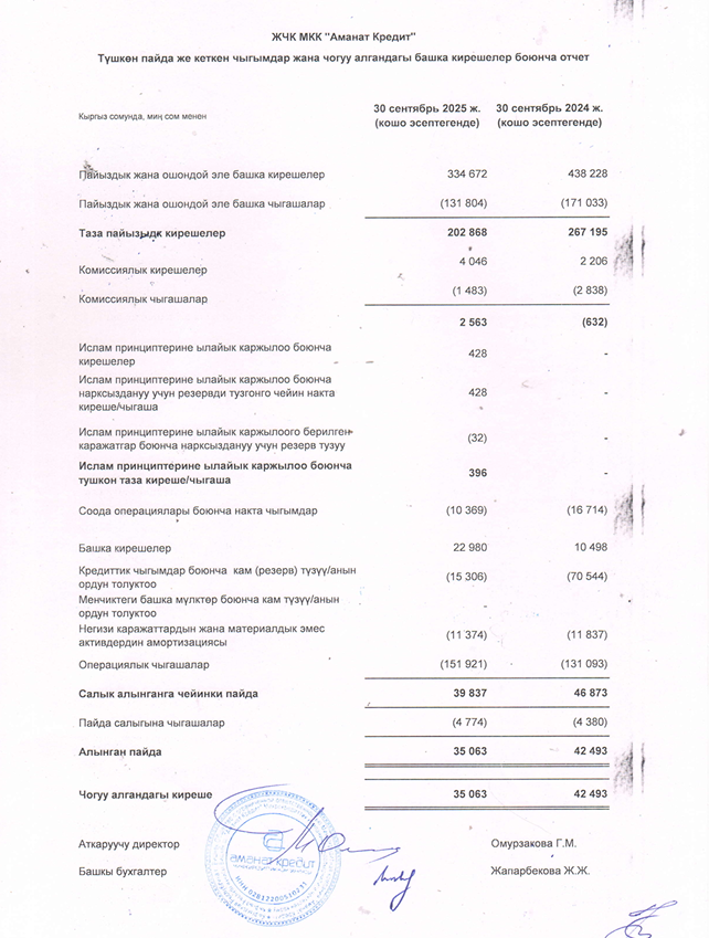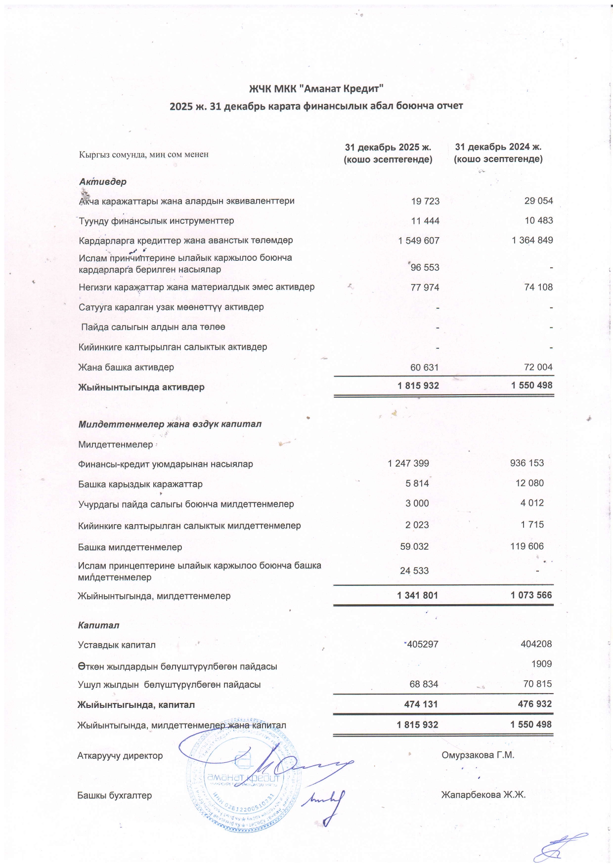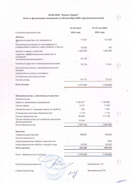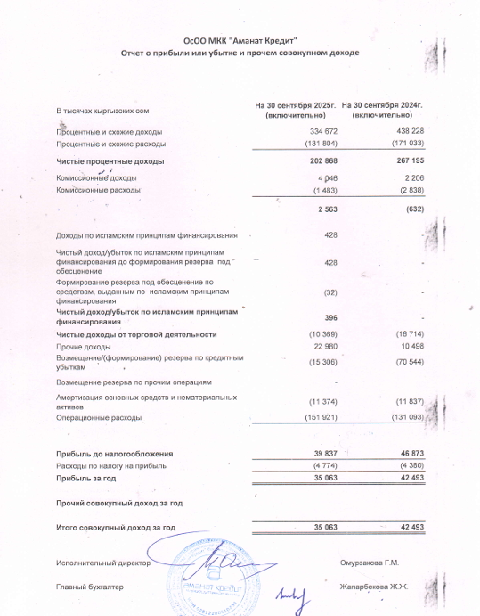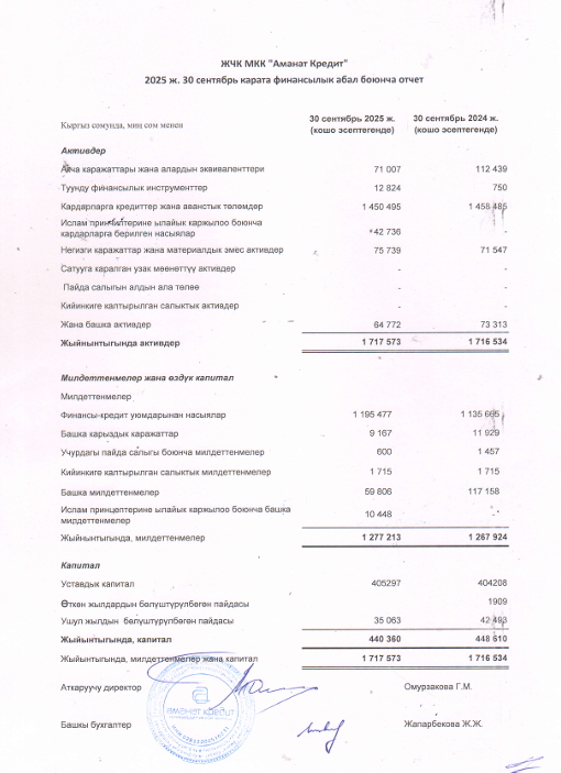 Миссия «Аманат Кредит»: Оказание содействия устойчивому развитию и увеличению благосостояния населения Кыргызской Республики путем предоставления широкого спектра кредитных продуктов. Миссия основана на ценностях компании: честность и открытость, профессионализм, преданность клиентам, командная работа, социальная и экологическая ответственность.