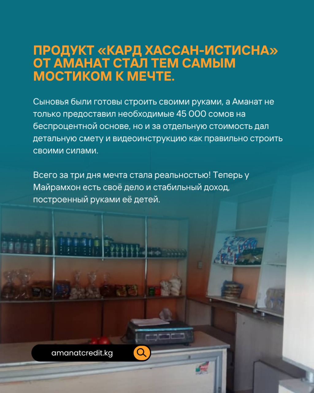 Миссия «Аманат Кредит»: Оказание содействия устойчивому развитию и увеличению благосостояния населения Кыргызской Республики путем предоставления широкого спектра кредитных продуктов. Миссия основана на ценностях компании: честность и открытость, профессионализм, преданность клиентам, командная работа, социальная и экологическая ответственность.